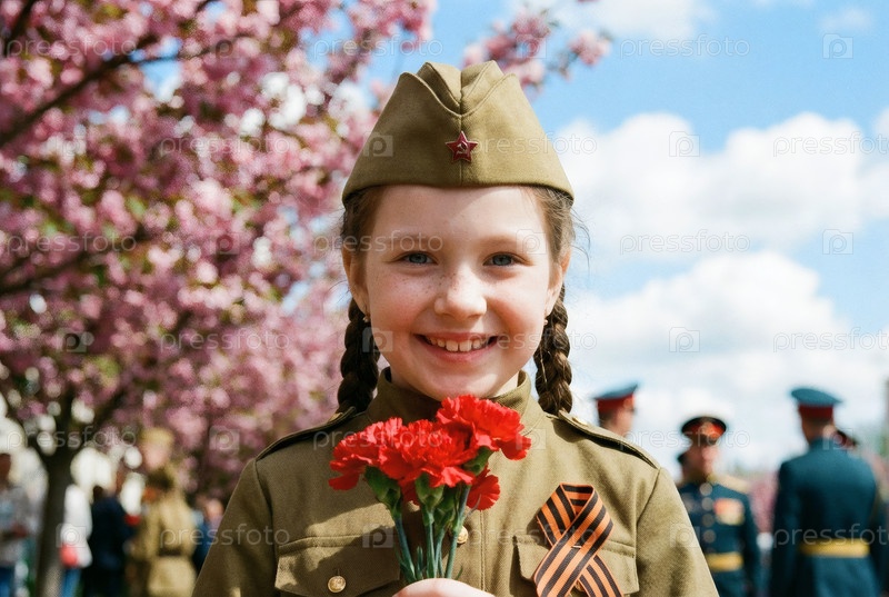 Концепция праздника 9 мая.Портрет девушки в военной форме с ленточкой Святого Георгия и красными гвоздиками, отмечающей День Победы в 1941-1945 годах