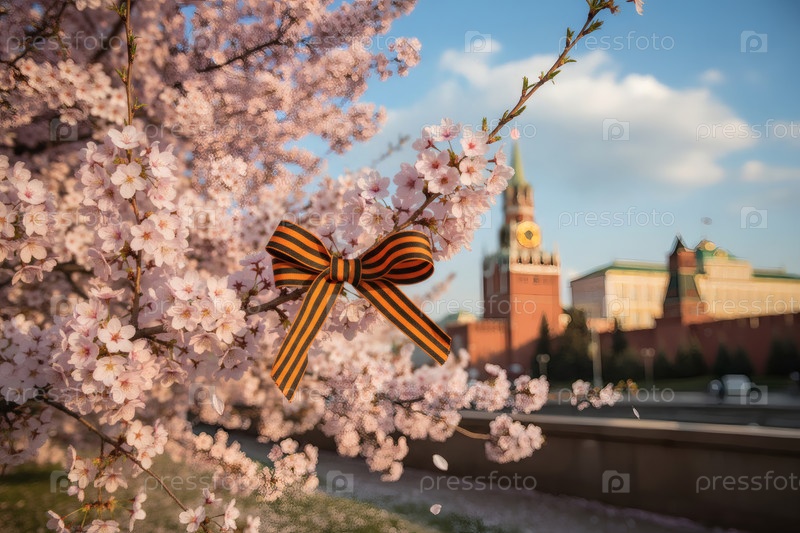 Знамя на 9 мая.Свято-Георгиевская лента и вишневый цветок.Концепция Дня Великой Победы 1941-1945 годов и День защитника Отечества