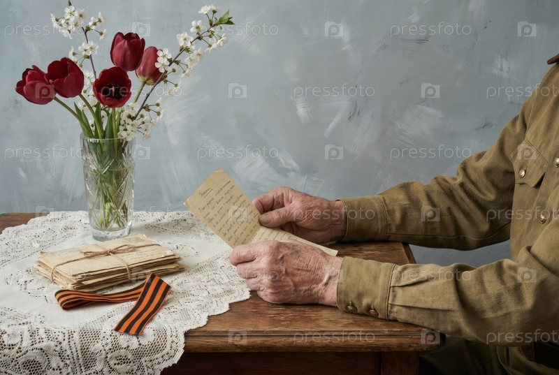 Концепция праздника 9 мая. пожилой солдат читает старые военные письма, сидя за столом. на сером фоне - ленточка Святого Георгия, буквы, воинская шапка и красные тюльпаны и вишни