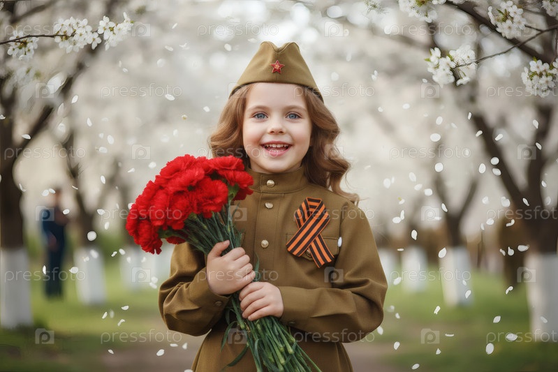 Концепция праздника 9 мая.Портрет девушки в военной форме с ленточкой Святого Георгия и красными гвоздиками, отмечающей День Победы в 1941-1945 годах