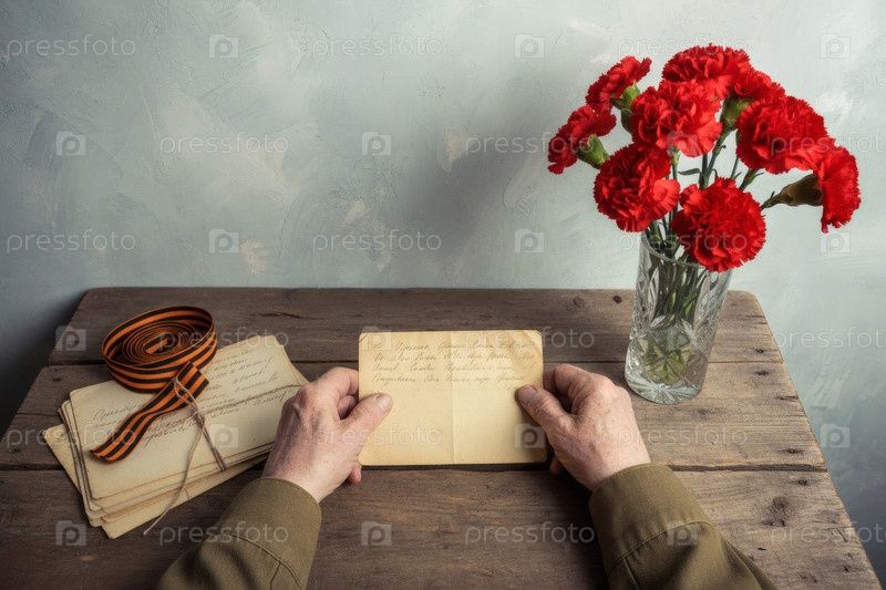 Концепция праздника 9 мая. пожилой солдат читает старые военные письма, сидя за столом. на сером фоне есть ленточка Святого Георгия, буквы, военная шляпа и красные гвоздики