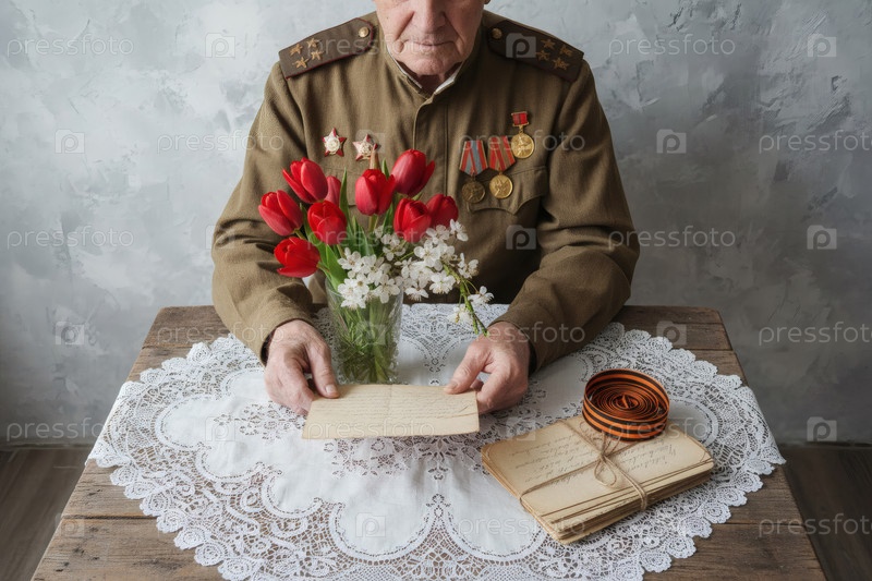 Концепция праздника 9 мая. пожилой солдат читает старые военные письма, сидя за столом. на сером фоне - ленточка Святого Георгия, буквы, воинская шапка и красные тюльпаны и вишни