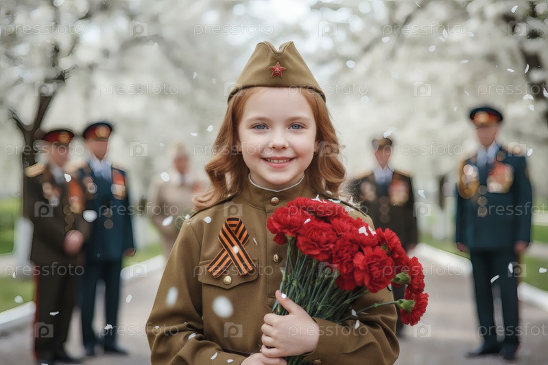Концепция праздника 9 мая.Портрет девушки в военной форме с ленточкой Святого Георгия и красными гвоздиками, отмечающей День Победы в 1941-1945 годах