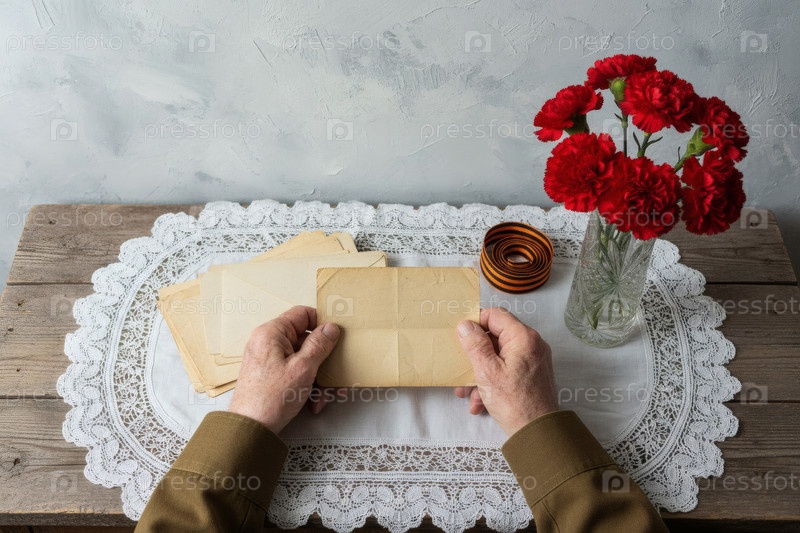Концепция праздника 9 мая. пожилой солдат читает старые военные письма, сидя за столом. на сером фоне есть ленточка Святого Георгия, буквы, военная шляпа и красные гвоздики