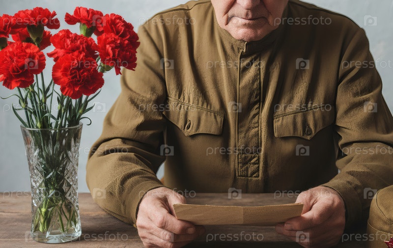 Концепция праздника 9 мая. пожилой солдат читает старые военные письма, сидя за столом. на сером фоне есть ленточка Святого Георгия, буквы, военная шляпа и красные гвоздики