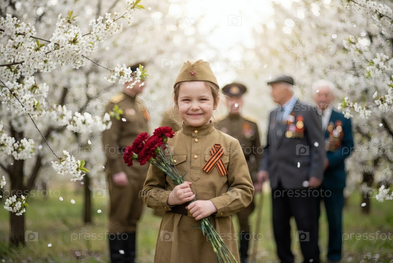 Концепция праздника 9 мая.Портрет девушки в военной форме с ленточкой Святого Георгия и красными гвоздиками, отмечающей День Победы в 1941-1945 годах