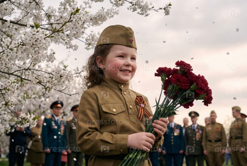 Концепция праздника 9 мая.Портрет девушки в военной форме с ленточкой Святого Георгия и красными гвоздиками, отмечающей День Победы в 1941-1945 годах