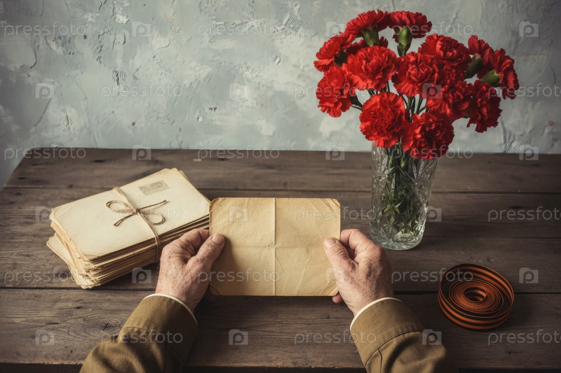 Концепция праздника 9 мая. пожилой солдат читает старые военные письма, сидя за столом. на сером фоне есть ленточка Святого Георгия, буквы, военная шляпа и красные гвоздики