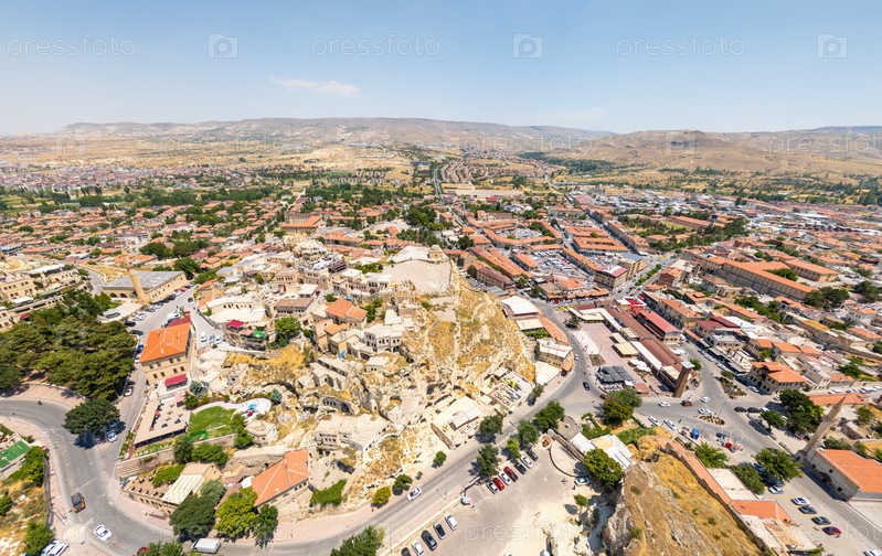 Обширная панорама с воздуха из Теменни-Тепеси, показывающая город, расположенный среди скалистых образований с древними жилищами и современными отелями