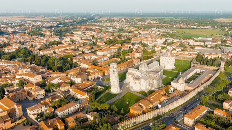 Пиза, Италия. Знаменитая наклонная башня и пизанский собор в Пьяцце деи Мираколи. Лето. Утренние часы, взгляд с воздуха