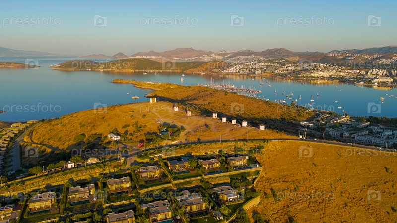 Бодрум, Турция. взгляд с воздушного дрона на исторические ветряные мельницы Бодрума на солнечном холме. древние каменные мельницы 18-го века под ярким утренним солнцем.. Aerial View