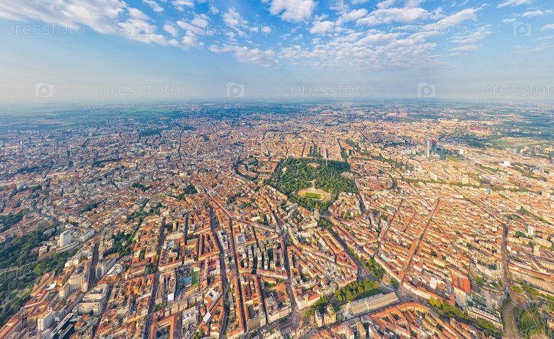 Милан, Италия Панорама центральной части города Летний облачный день Вид с воздуха
