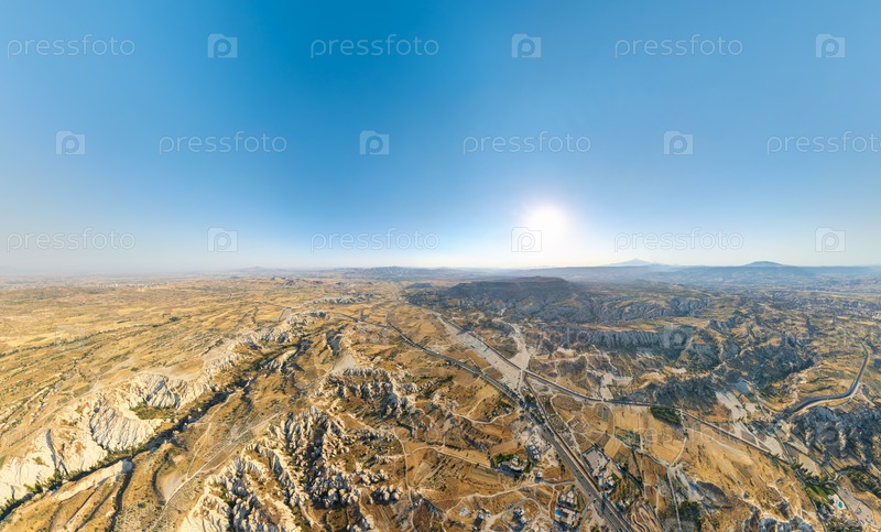 Широкий панорамный взгляд из воздуха на глубоко эродированные долины, пересекающие вулканическое плато с волшебными дымоходами и скальными столбами в солнечном утреннем свете