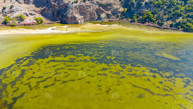 Снимок из воздушного дрона пляжа Изтузу, где река Далян впадает в Средиземное море, золотой песок и зеленые горы под летним солнцем