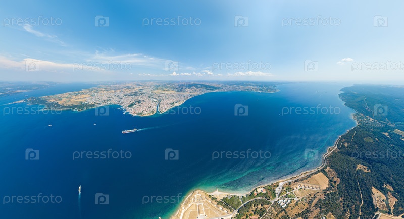 Бастион Rumelia Mecidiye и бастион Namazgah на Дарданелльском проливе с грузовым кораблем и паромами, вид на Килитбахир и Канаккале