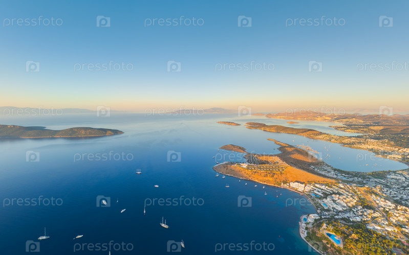 Премиальный утренний вид, демонстрирующий роскошные яхты в лазурном заливе, эксклюзивные острова и парусный рай для маркетинга высококлассных курортов