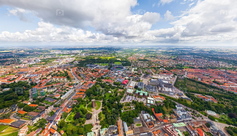 Хельсингборг, Швеция. Башня Карнан. Панорама города летом. Орезондский пролив. Вид с воздуха