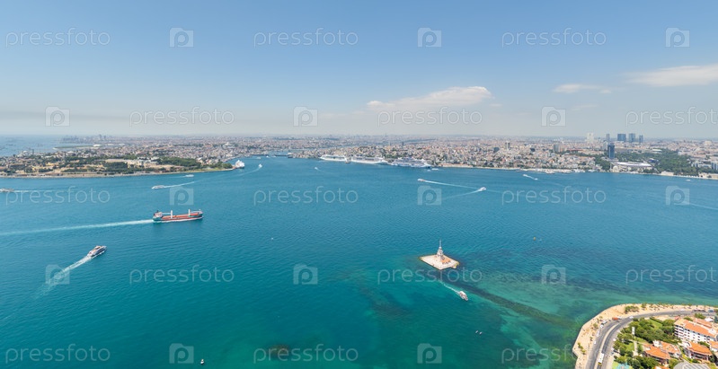 Босфорский пролив с сухим грузоносцем в Золотом Роге, Девичьей башне и районах Фатих, Бейоглу, Ускудар
