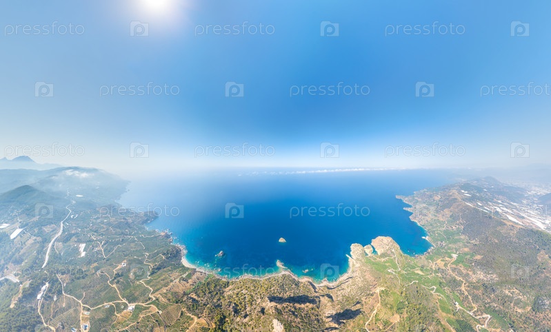 Гюнейкой, Анталия, Турция Широкий взгляд с воздуха на береговую линию Средиземного моря с банановыми плантациями на прибрежных склонах, теплицы, скалистая береговая линия и глубокое синее море