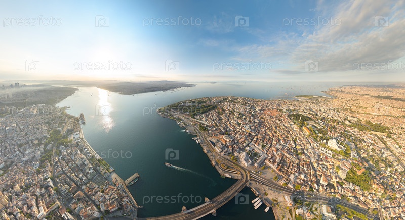 Панорама широкоугольного беспилотного летательного аппарата на входе в Босфор, устье Золотого Рога с мостом Галата, Мраморное море