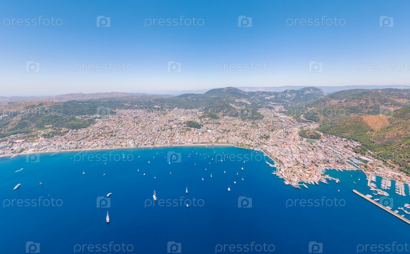 Широкий воздушный вид города, расположенного между береговой линией и лесистыми горами, с пляжными отелями на берегу под ярким солнечным днем