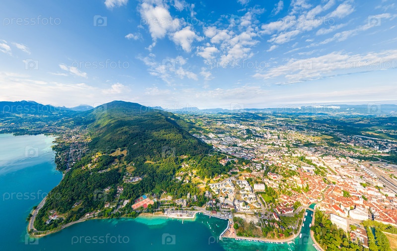 Озеро Аннеси с окружающими горами и деревнями Панорама летом Французские Альпы Вид с воздуха