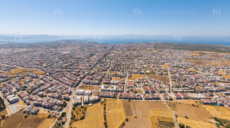 Дидим, Турция. высокоугольный вид прибрежной местности с лоскутными фермами, городским поселением и горами