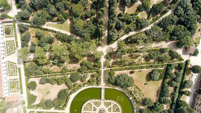 Флоренция, Италия. Палаццо Питти - Королевский дворец эпохи Возрождения. Сады Боболи (Giardino di Boboli) - Классический сад XVI-XVII веков. Летом вид с воздуха