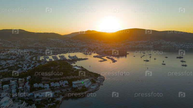 Бодрум, Турция.Утренний вид с беспилотника на холм Tiger Tower в фоновом освещении, яхта-марина, яхты, замок Бодрум и белые дома. Яркое солнце позади гор.. Aerial View
