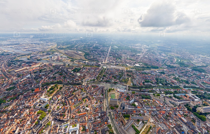 Гент, Бельгия. Центр города и его окрестности. Жилые и промышленные районы. Панорама на город. Летний день, облачная погода. Вид с воздуха