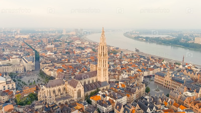 Антверпен, Бельгия. шпиль с часами собора Богоматери (Антверпен). Исторический центр Антверпена. Город расположен на реке Шелде (Эскаут). Летнее утро, Aerial View