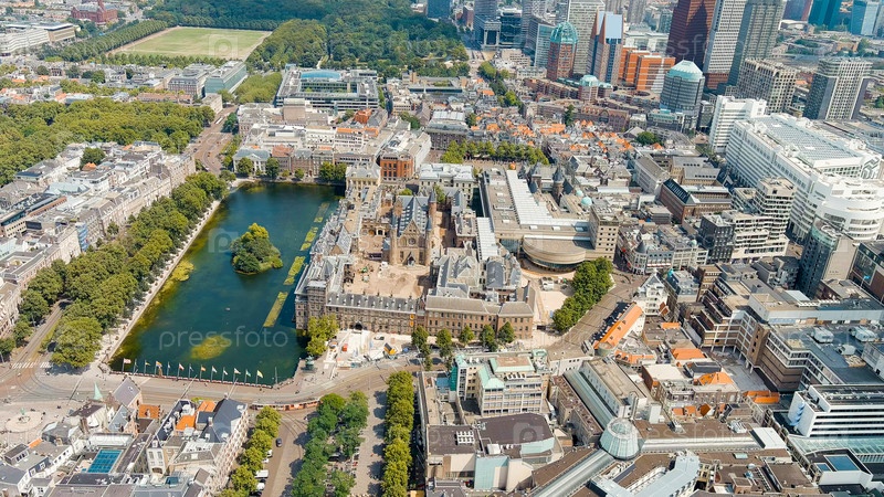 Гаага, Нидерланды. Binnenhof. Озеро Хофвиджвер в историческом центре города. Облачная погода. Летний день, Aerial View