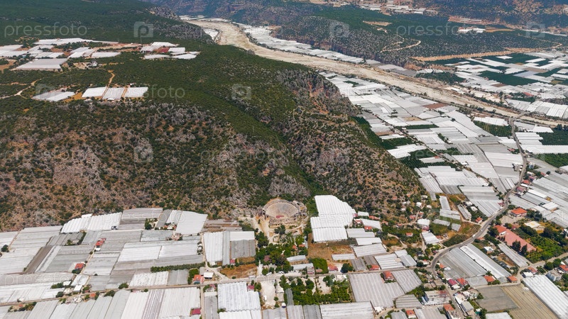 Эпическая воздушная панорама речной долины с древним амфитеатром Миры, скальными гробницами и крепостью на обрывах