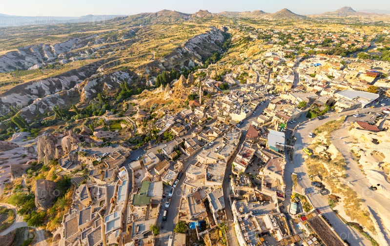 Панорама из воздуха города Учисар с традиционными каменными домами, пещерными жилищами и узкими улочками, вырезанными в склоны холма под утренним светом