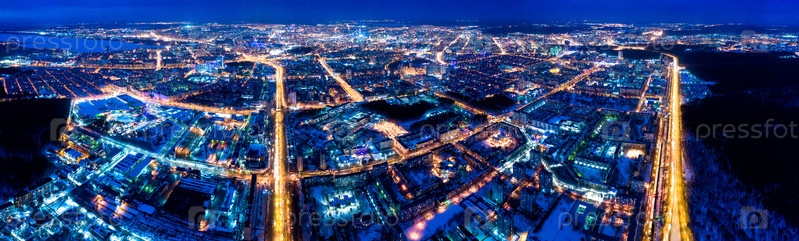 Екатеринбург, Россия.Панорама ночного аэропорта города.Уличные фонари, освещенные фонарями