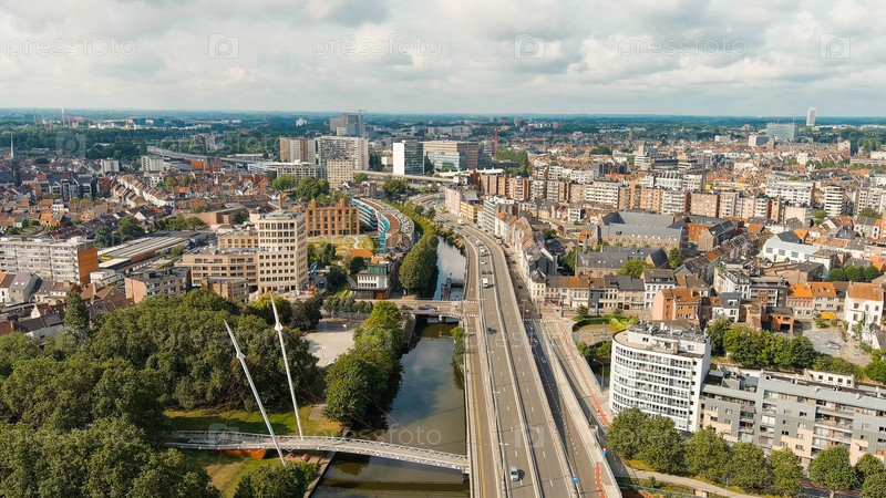 Гент, Бельгия. набережная реки Эско (Шелда). панорама города с воздуха. облачная погода, летний день, Aerial View