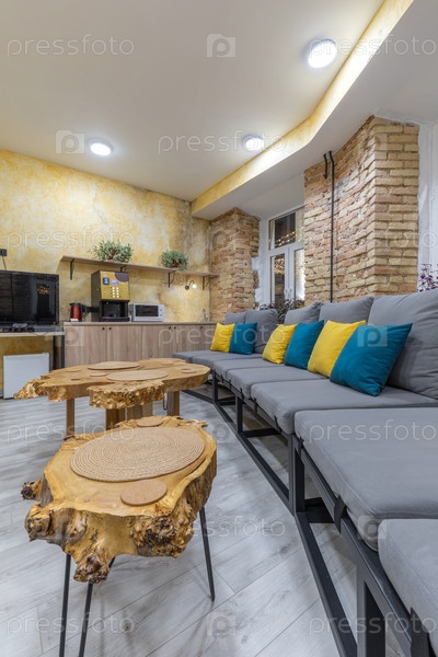 Современный гостиничный салон с длинным серым диваном с желтыми и синими подушками, открытые кирпичные стены и уникальные деревянные кофейные столы. включает в себя кухонную комнату с кофемашиной и микроволновой печкой. модный функциональный интерьер для