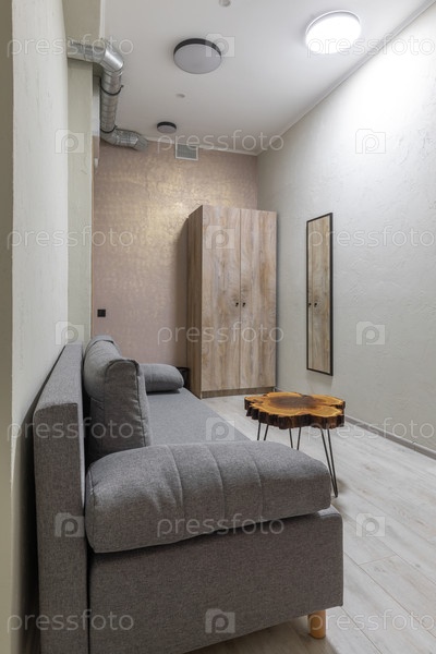 Минималистская общая комната в общежитии с удобным диваном из серой ткани, деревянный кофейный стол и высокий гардероб