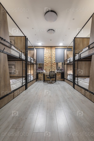 Современный номер в общежитии, имеющий симметричную планировку с деревянными двухъярусными кроватями по обе стороны, центральное рабочее пространство со столом и большими окнами