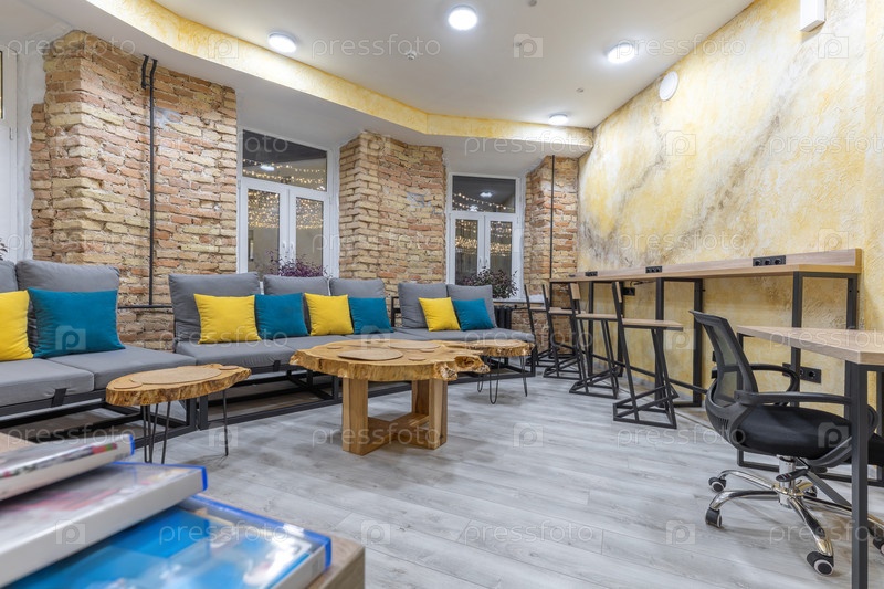 Просторная общая зона хостела с длинным серым диваном с желтыми и синими подушками, открытые кирпичные стены и современные деревянные столы.Интерьер включает в себя специальное коворкинг-пространство с высокими барными стульями и функциональным офисным ст