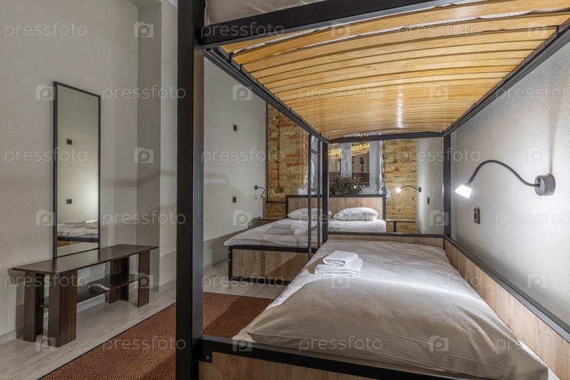 Современный интерьер номера общежития с прочной деревянной двухэтажной кроватью с интегрированным освещением, двуспальной кроваткой со свежим бельем и зеркалом