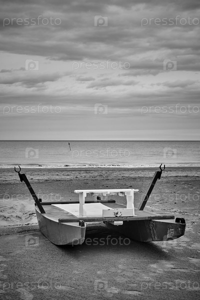 Пустынный пляж с спасательной лодкой у моря в Римини
