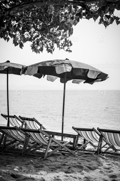 Пляж в Таиланде с длинными креслами и зонтиками