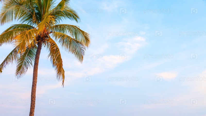 Пальма на тропическом побережье против голубого неба