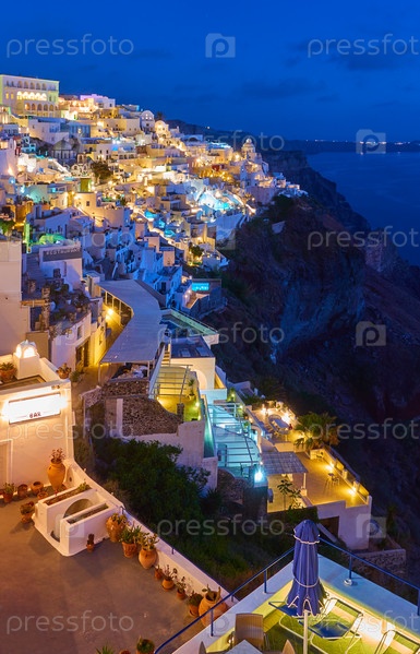Ярко освещенный город Фира на острове Санторини при закате