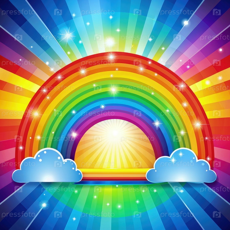 Вибрирующий радужный фон с облаками и сияющим солнцем. генеративная ИИ