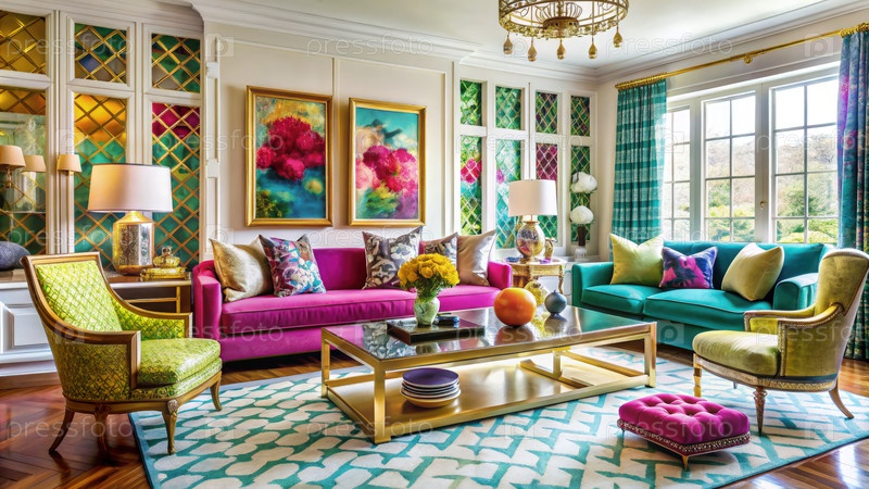 Живая гостиная с розовыми и зелеными диванами, золотыми акцентами и геометрическими узорами