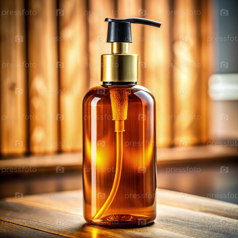 Янтарная пластиковая бутылка с насосным распределителем на деревянной поверхности