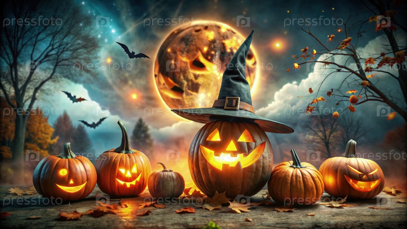 Джек-О-Лантерн Хэллоуин празднование с колдовской шляпой под полнолунием