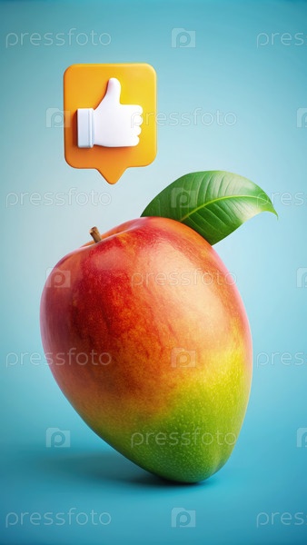 Зрелый манго с иконой "Вверх пальцы" на синем фоне